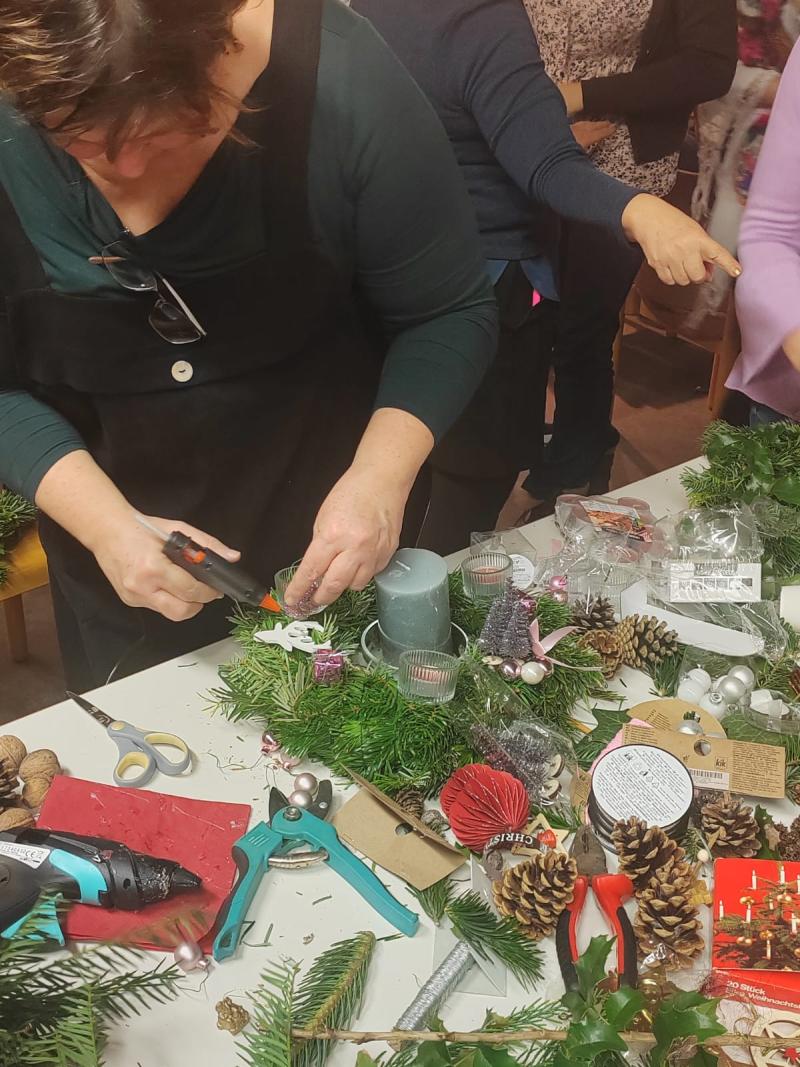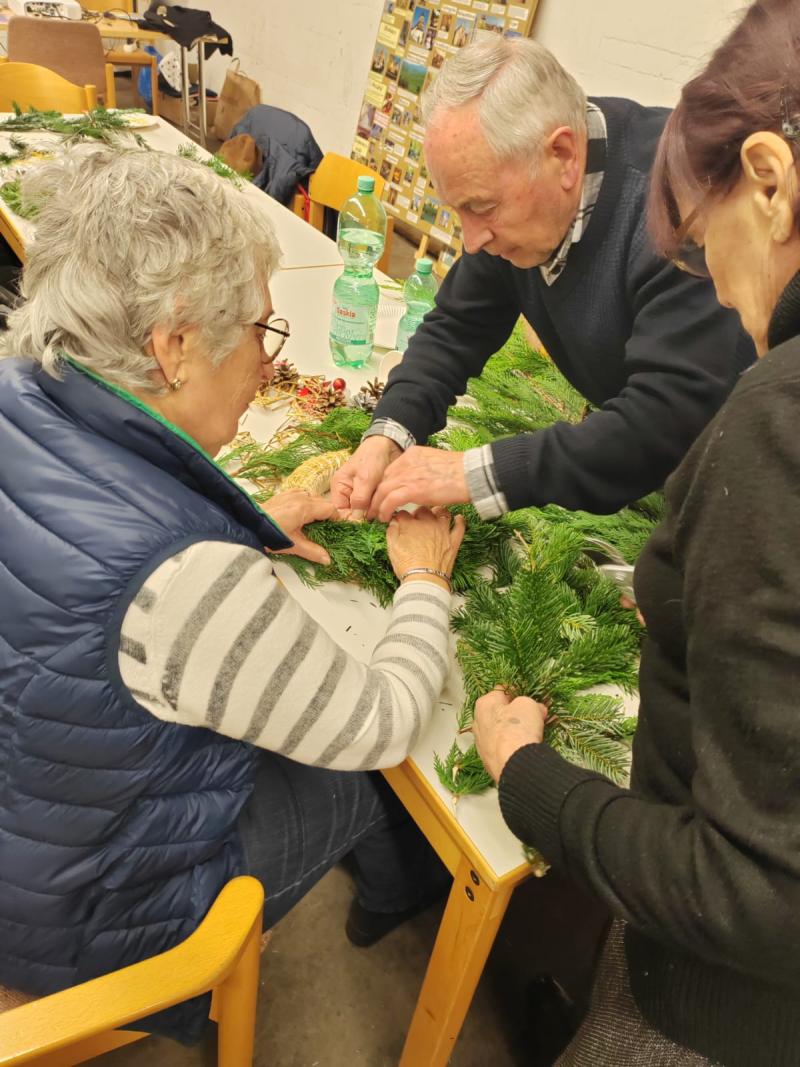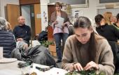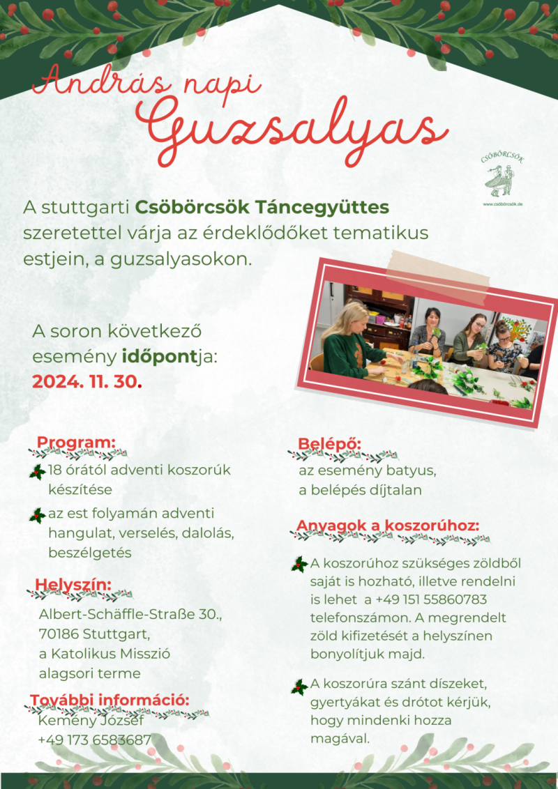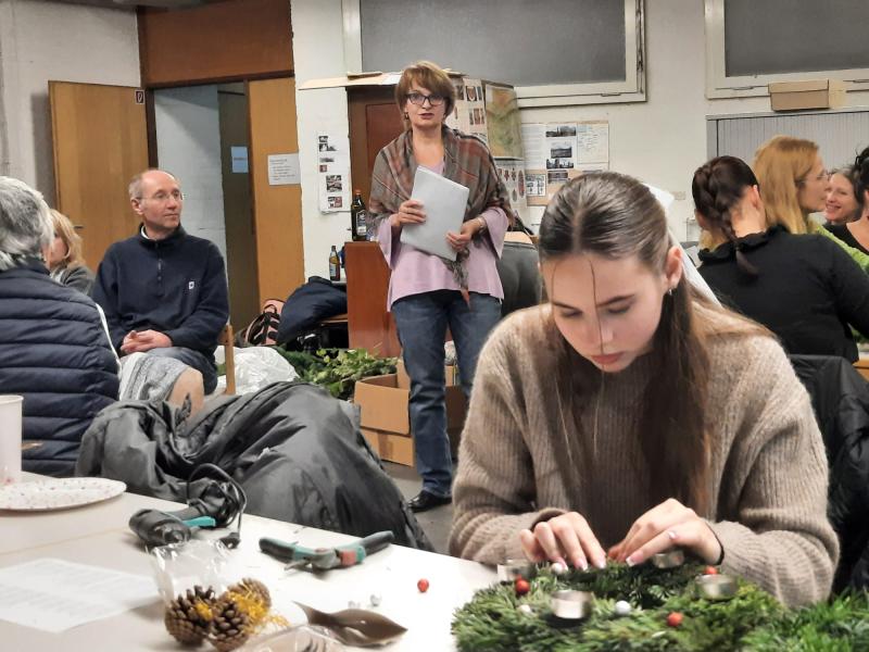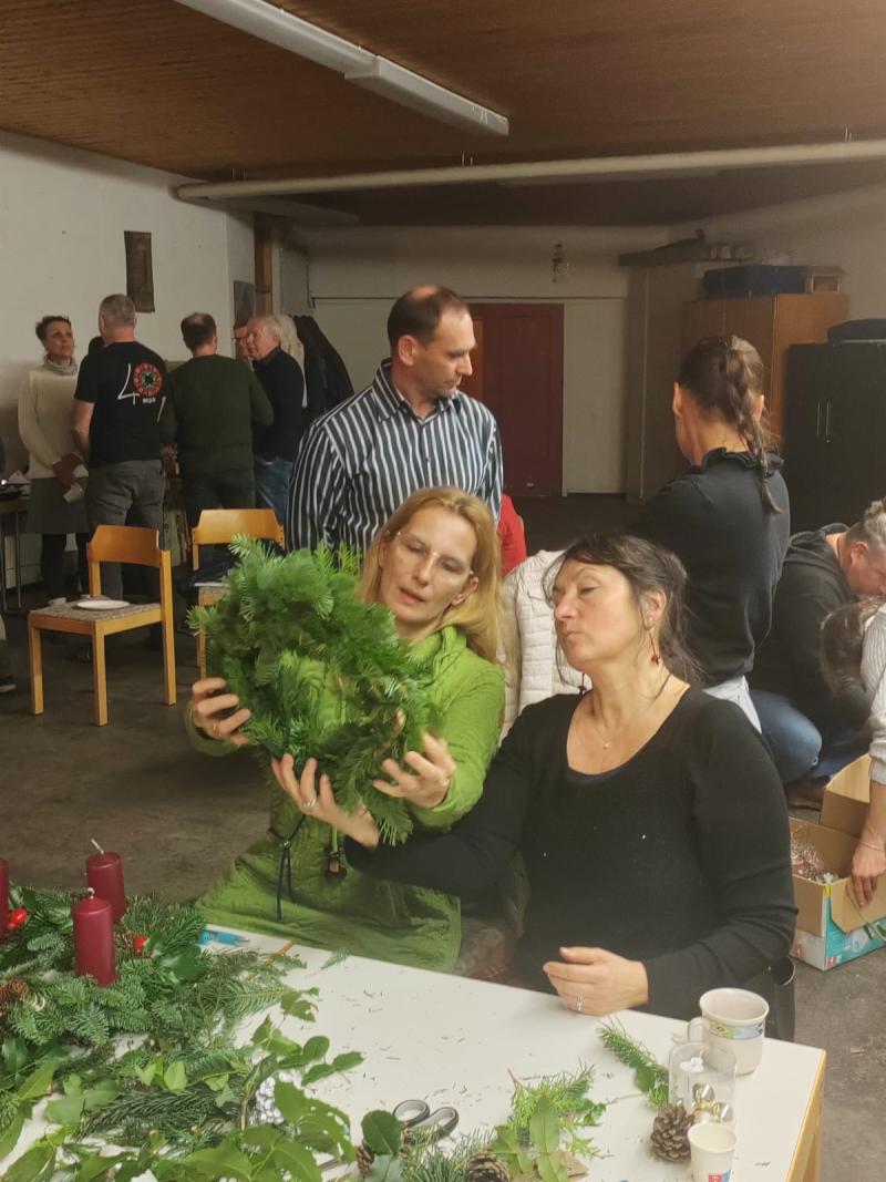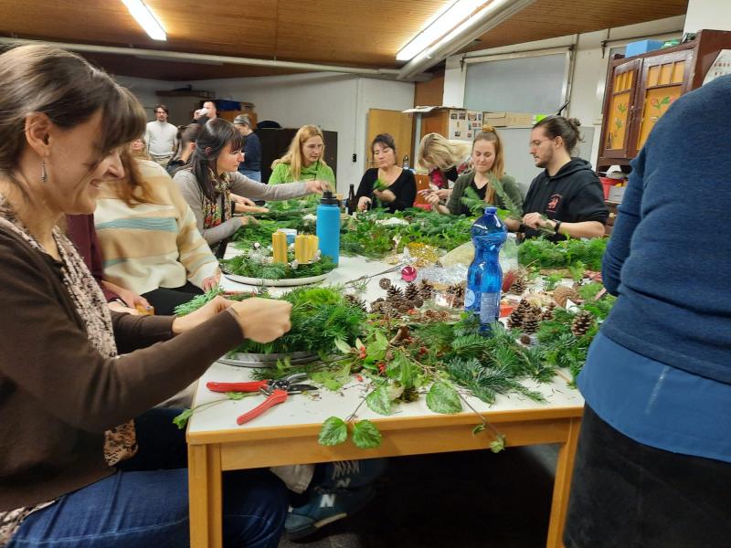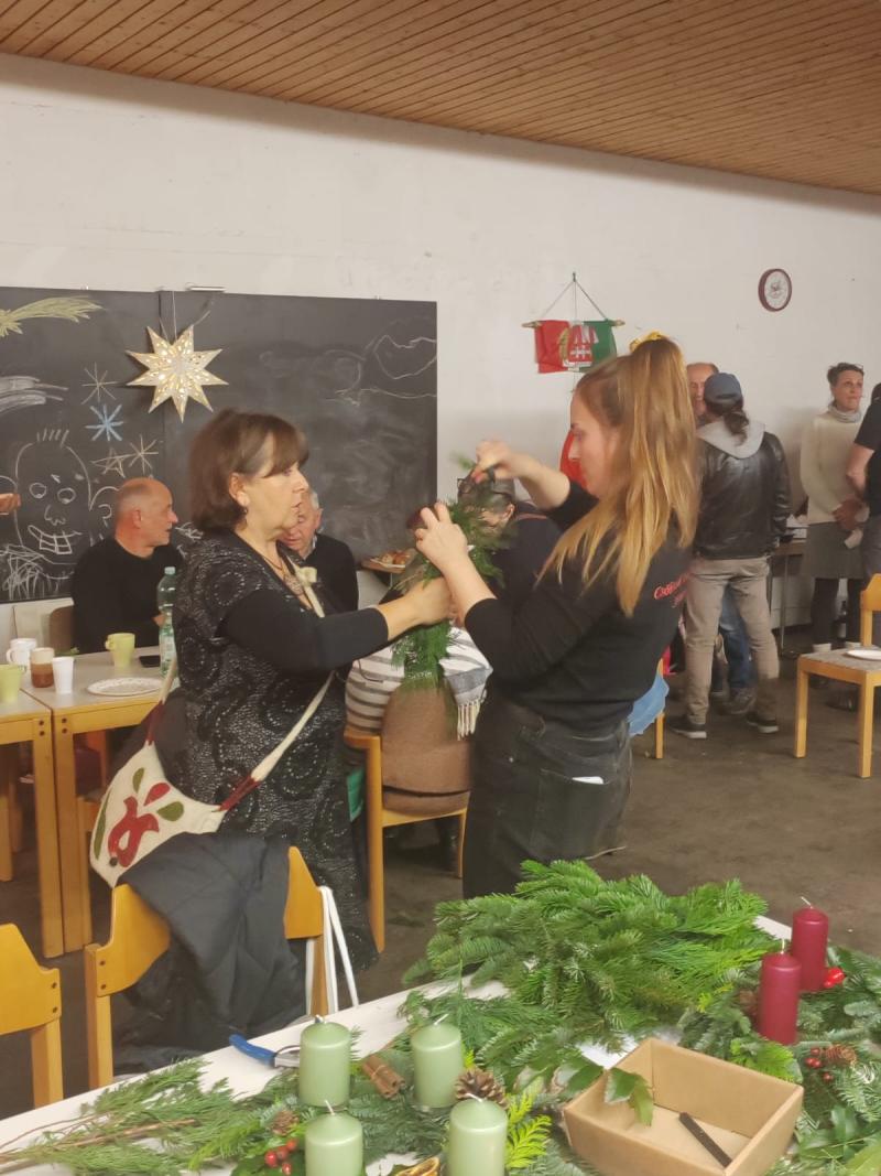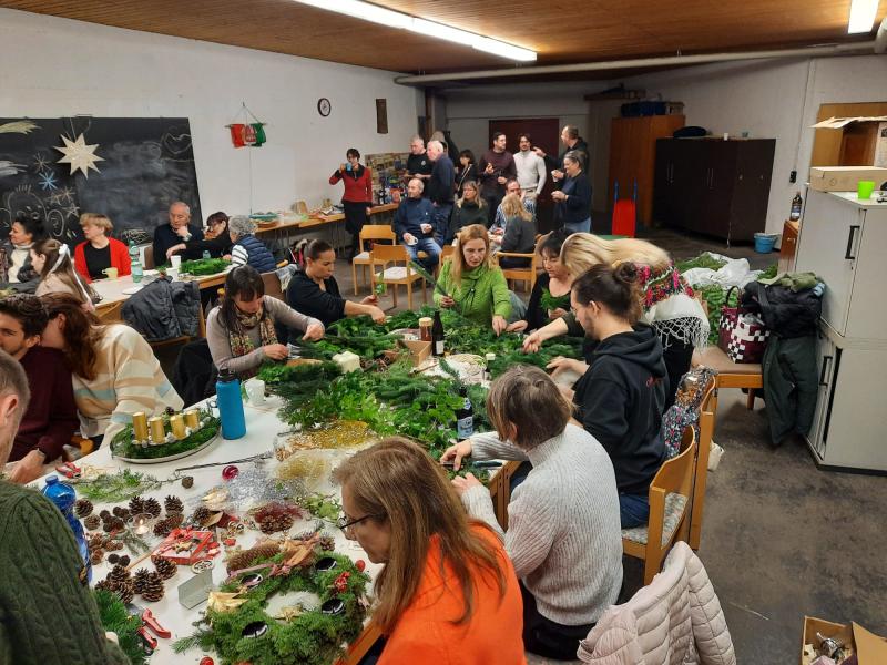 2024. november 30-án adventi hangulat töltötte meg a stuttgarti Katolikus Misszió alagsori termét. Az ajtón belépőket fenyőillat, karácsonyi zenék, képek és finom falatok, valamint a már az adventi koszorúk készítéséhez berendezett asztalok és eszközök fogadták.