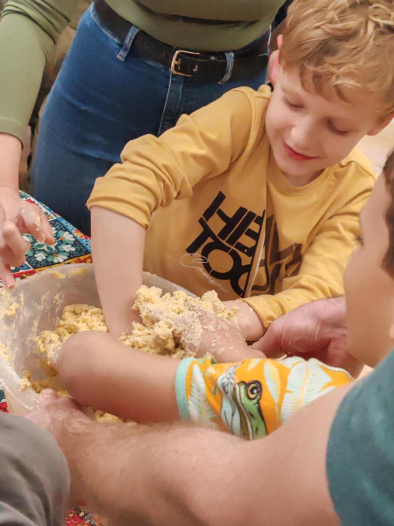 A rendezvényen gyerekek és felnőttek együtt gyúrták és szaggatták a tésztát, majd amíg Boglárka mesélt, a pogácsák a sütőben sültek. A program végén mindenki jóízűen elfogyasztotta a saját készítésű „hamuban sült” pogácsáját – pont úgy, ahogy a mesékben történik.