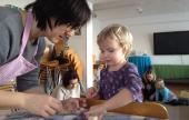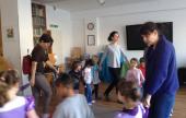 Dóri vidáman fogadja az érkezőket, mindenkinek örül, mindenkire nevet. Van, aki most jött először, és még bátorítani kell, de a hangulat már az első találkozásnál barátságos. S miután a gyerekek készen állnak, indulhat a közös „vonat”, kézen fogva, énekelve lépnek be a terembe.