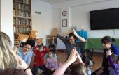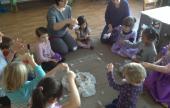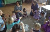 A megilletődött, álmos gyerekarcok hamar felélednek a közös éneklés során: először vattahópelyhekkel szórják tele a szőnyegen megbúvó kis veréb fészkét, majd kezecskéikkel házikót formálva menedéket adnak a kismadárnak. Néhány később csatlakozó gyerek is nagy örömmel kapcsolódik a játékba. Akkor tudom meg, hogy valahol esett a hó előző este, sőt, egyesek még szánkózni is mentek kora reggel. Később Dóri találós kérdésekkel kelti fel a gyerekek érdeklődését, amelyek mindegyike egy-egy téli ruhadarabra vonatkozik. A kicsik lelkesen keresgélik a teremben elrejtett számokat, amelyek alatt a találós kérdések, illetve a kis ruhadarabokat ábrázoló képecskék rejlenek.