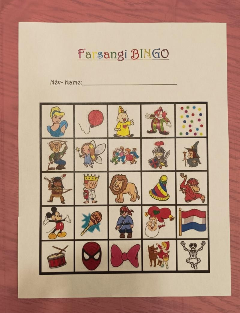 Az ünnepség második felében rendeztünk egy farsangi BINGO versenyt, melyen a szülők is örömmel vettek részt. A győztes ízletes sültkolbásszal tömhette meg a pocakját. Természetesen nem volt hiány a farsangi fánkból, bejgliből, gyümölcsökből, zöldségekből, és más egyéb finomságokból sem.