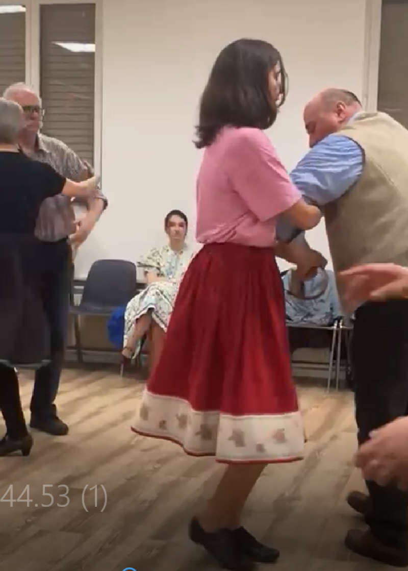Este fél héttől a felnőttekkel roptuk, nagyon jó hangulatban, jó négy órán keresztül: elsősorban moldvai csángó, illetve felcsíki székely táncokat. Az egyik „szünetben”, aktív pihenés gyanánt, néhányan eljártuk, bemutattuk közkedvelt mezőségi páros-, illetve legényes táncunkat.