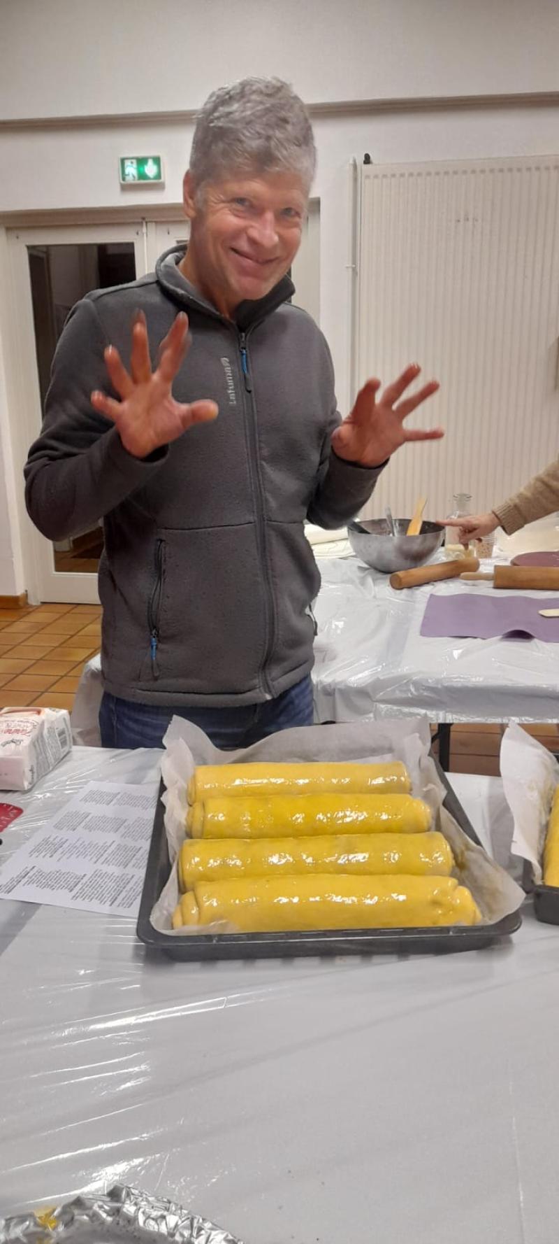 Amíg a tészta kelt, karácsonyi műsort tartottam a résztvevők számára, illetve meg is énekeltettem őket. A magyar kántálások után még néhány francia népies karácsonyi éneket is elénekeltünk, a francia házastársak örömére.