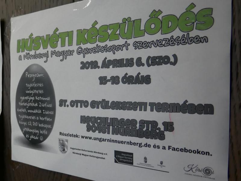 Áprilisban rövid időre lelassul a magyar élet Nürnbergben: sokan utaznak haza rokonlátogatóba Magyarországra vagy a Kárpát-medence magyarlakta területeire. A helyi magyarság körében azért akadnak olyanok is, akik nem utaznak el a húsvéti időszakra. Nekik a szülőhazájukban töltött húsvét helyett, a hazalátogatóknak pedig az otthoni rokonlátogatás előtt lehetett kellemes közösségi élményben részük a Nürnbergi Magyar Kultúregyesület gyerekcsoportjának húsvéti családi délutánján, 2019. április 6-án. Galéria.