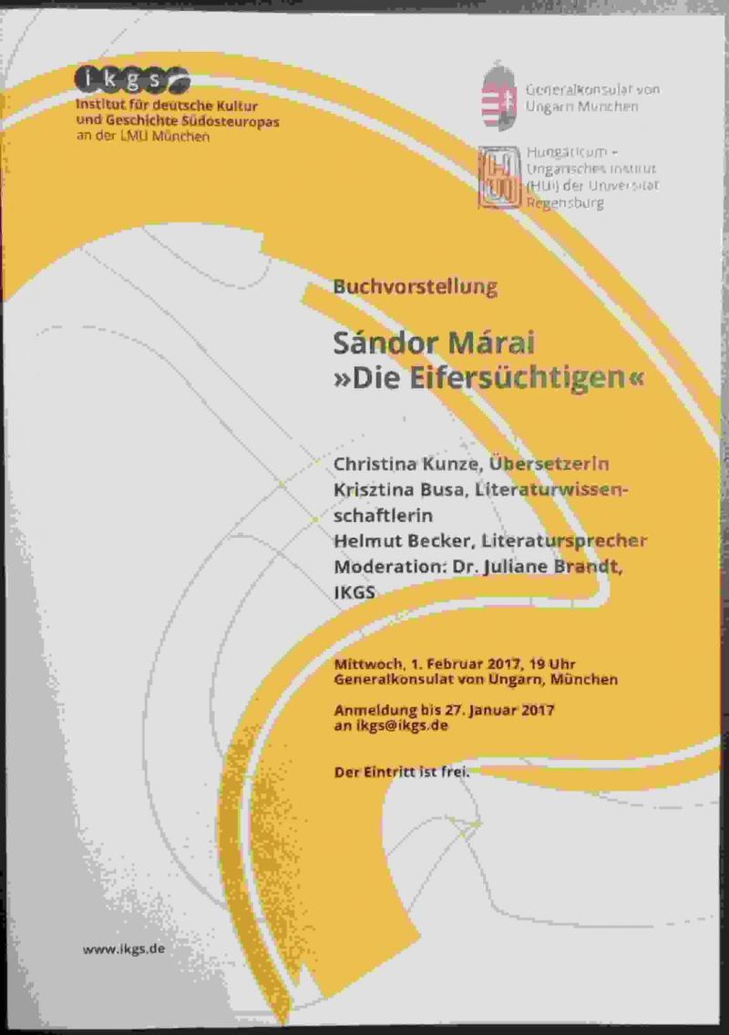 A Müncheni Magyar Főkonzulátus adott helyet február elsején annak a könyvbemutatónak, amely Márai Sándor A féltékenyek című művének új német fordítását mutatta be. Az esemény főszervezői a Hungaricum – Ungarisches Institut (HUI) der Universität Regensburg (Regensburgi Egyetem Hungarológia-Magyar Intézete) és az Institut für deutsche Kultur und Geschichte Südosteuropas (IKGS) an der LMU München (Lajos Miksa Egyetem - Délkelet-Európai Német Kultúra és Történelem Intézete) voltak. Az eseményt Spiller Krisztina, a magyar közösséggel való kapcsolattartásért felelős konzul nyitotta meg. A könyvet a fordító, Christina Kunze, az irodalomtörténész, Busa Krisztina és Helmut Becker, a Bajor Színiakadémia docense mutatta be. A moderátor Juliane Brandt volt, az IKGS tudományos munkatársa.