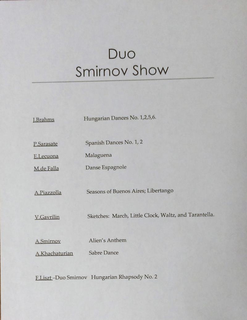 A Smirnov Duó tulajdonképpen egy friss zongorista házaspár. Angelika ungvári születésű magyar, férje Anton, orosz nemzetiségű zongoraművész. Kettejük találkozásának köszönhető az a bájos, egyszersmind magával ragadó és hihetetlen magas szinvonalú zongora-show, amit a Los Angeles-i Egyesült Magyar Házba látogatóknak volt szerencséjük látniuk és hallaniuk.
