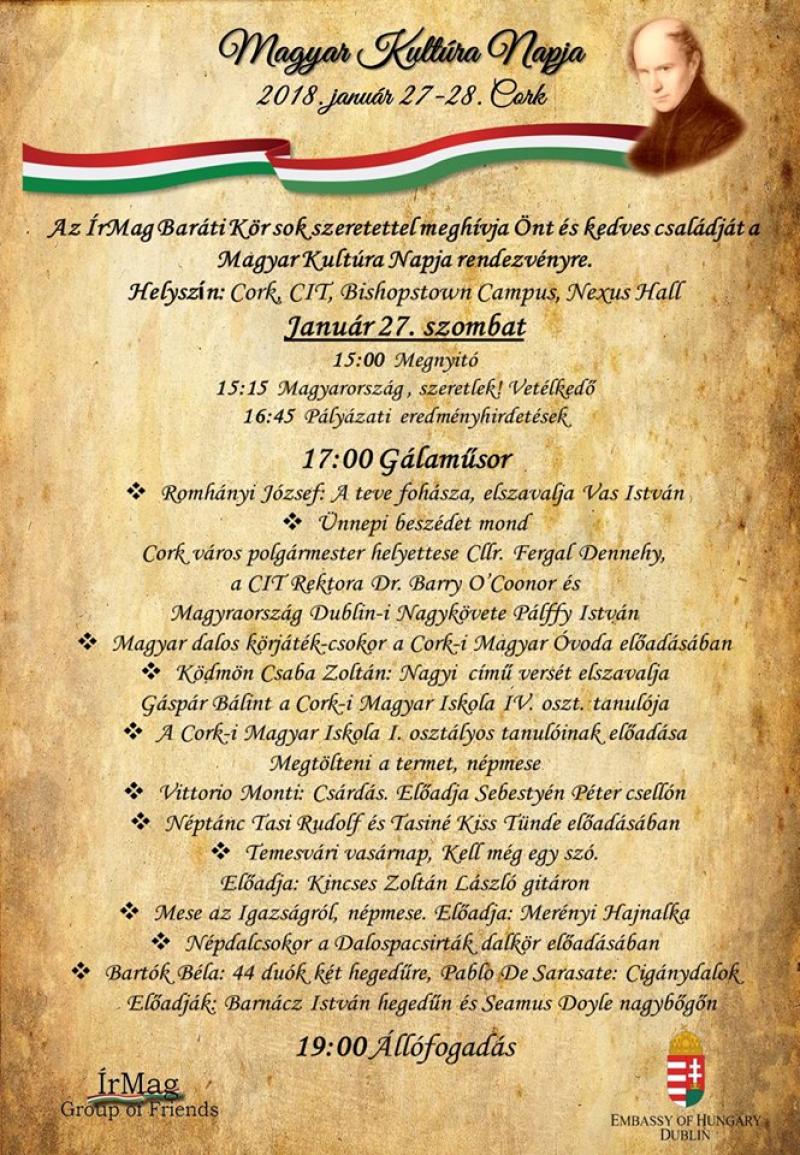 A Magyar Kultúra Napja a Cork környéki magyarok legnagyobb kulturális rendezvénye, amelyet az ÍrMag Baráti Kör szervez 2016 óta minden évben. Az idén január 27-28-án gyűltek össze az írországi magyarok Corkban, hogy magyarul vetélkedjenek, szórakozzanak, táncoljanak, ismerkedjenek egymással, és finom magyar ételeket fogyasszanak.