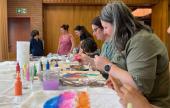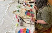 A júniusi alkalom a textilfestésé volt. A résztvevők színes batikolt pólókat készíthettek, illetve sokan vászontáskára festettek textilfestékkel. A gyerekek körében főleg a batikolás volt népszerű, kitartóan mártogatták a festékbe az anyagaikat, a végén pedig csodálatosan tarka lett az eredmény.