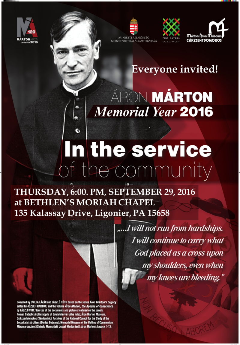Ez alkalomból emlékeztünk Márton Áronra, Erdély Püspökére 2016 szeptember 29-én, a püspök halálának 36. évfordulóján itt a ligonieri (PA) Bethlen Közösségben.