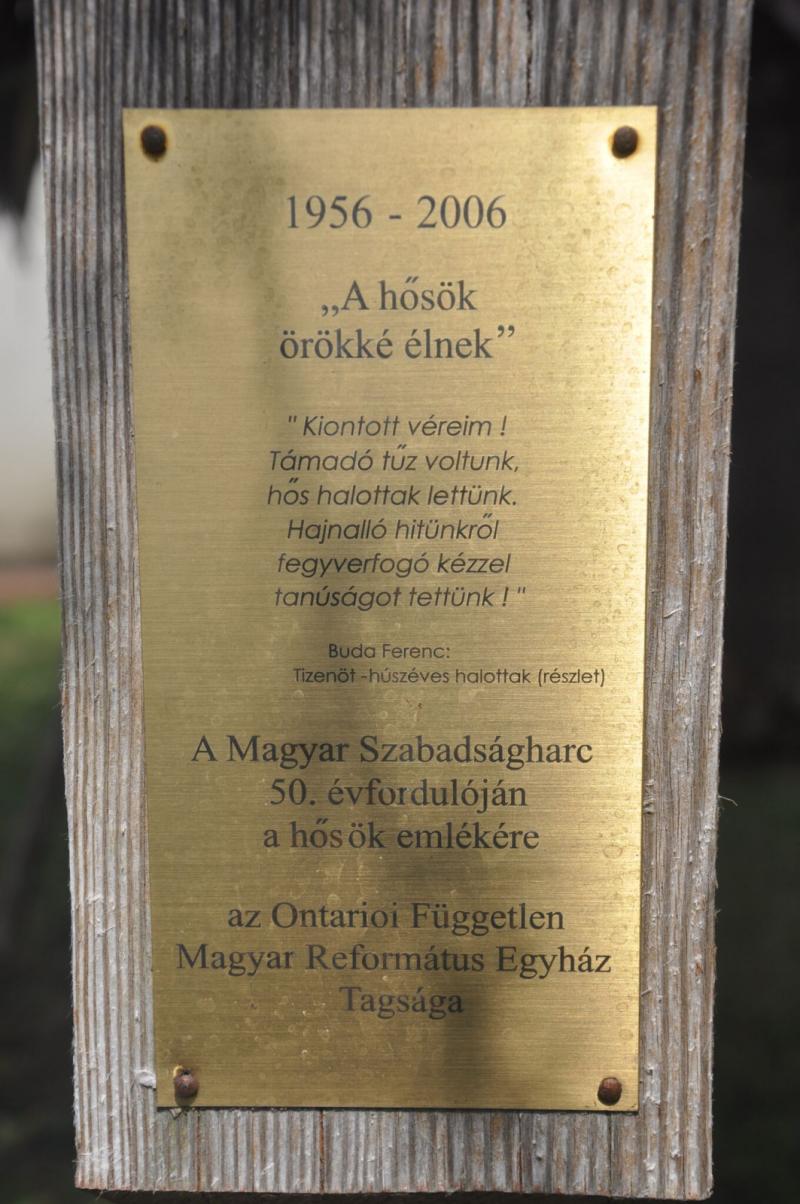 A templom kertjében, a forradalom félévszázados emlékére 2006-ban állított kopjafa körül minden évben ünnepséget rendeznek. A forradalom hőseire emlékezve koszorút helyezett el Széles Tamás főkonzul és felesége. Az Ontarioi Magyar Független Református Egyház piros-fehér-zöld színekben pompázó csokrát Bekő Erzsébet gyülekezeti tag és főtiszteletű Szabó Sándor tiszteletbeli püspök helyezték el. A megemlékezés virágainak elhelyezése után a szabadságharc hőseiről emlékezett meg Szabó Sándor. Hangsúlyozta a nemzetünk nagy eseményeiről, ünnepeiről való méltó megemlékezés fontosságát, külön kiemelve a fiatalabb generációk tanításának fontosságát. A templomkert kopjafái között áll az október 6-i nemzeti gyásznapra emlékeztető Aradi vértanúk faragott oszlopa is.