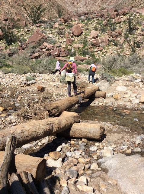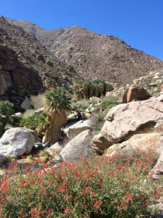 A klubtagokkal a Palm Canyon Trail ösvényt választottuk, és nagy szerencsénkre nem csak virágokat láthattunk, hanem az egyébként szinte mindig kiapadt mederben sebesen csobogó patakot is.