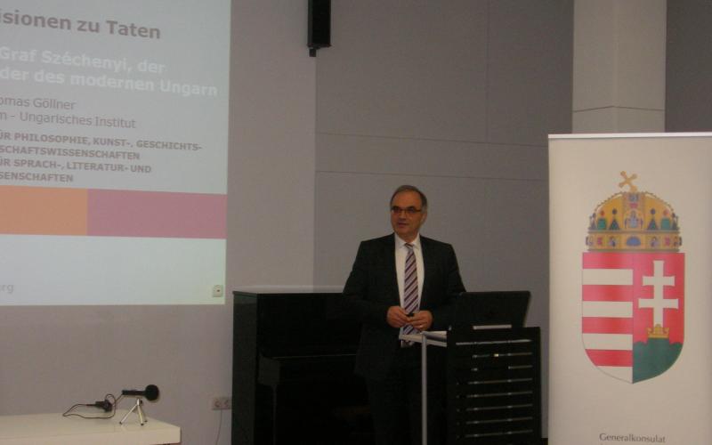 A Müncheni Magyar Főkonzulátus és a Regensburgi Egyetem Hungaricum - Magyar Intézete közös Széchenyi-estet rendezett a Regensburgi Egyetemen. A rendezvényt a Regensburgi Előadások rendezvénysorozat egyik eseményeként is jegyezték. Az est apropója Széchenyi István gróf születésének 225. évfordulója volt. A 18 órakor kezdődő ünnepségen Tordai-Lejkó Gábor főkonzul úr köszöntötte a jelenlévőket, majd dr. Ralf Thomas Göllner - a Magyar Intézet munkatársa - tartott előadást gróf Széchenyi István életéről és tevékenységéről „A vízióktól a tettekig. Széchenyi István, a modern Magyarország alapítója” címmel. A nagy számú közönség körében jelen voltak az egyetem délkelet-európai kutatásokkal foglalkozó társintézményeinek munkatársai, a Regensburg és környéke magyar közösségének tagjai, valamint a Hungaricum kiegészítő szakképzésben résztvevő egyetemi hallgatók és családtagjaik. Az előadás után a közönség megtekinthette a Széchenyi István gróf életét és munkásságát bemutató – tartalmában és kivitelezésében - igen színvonalas vándorkiállítást. A Müncheni Magyar Főkonzulátus részéről a főkonzul úr mellett Spiller Krisztina konzul asszony is megtisztelt bennünket, a Magyar Intézet részéről pedig dr. K. Lengyel Zsolt igazgató köszöntötte a vendégeket.