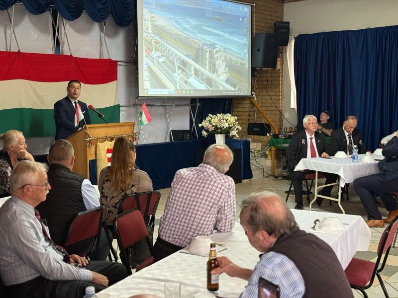 A Dél-afrikai Magyar Szövetség hagyományos, ebéddel egybekötött megemlékezését idén nemzeti ünnepünk pontos naptári napján, március 15-én, szombaton tartotta a Johannesburg határában fekvő Magyar Tanyán. A rendezvényt megtisztelte jelenlétével a munkatársai kíséretében érkező Horváth Attila, Magyarország pretoriai nagykövete is.