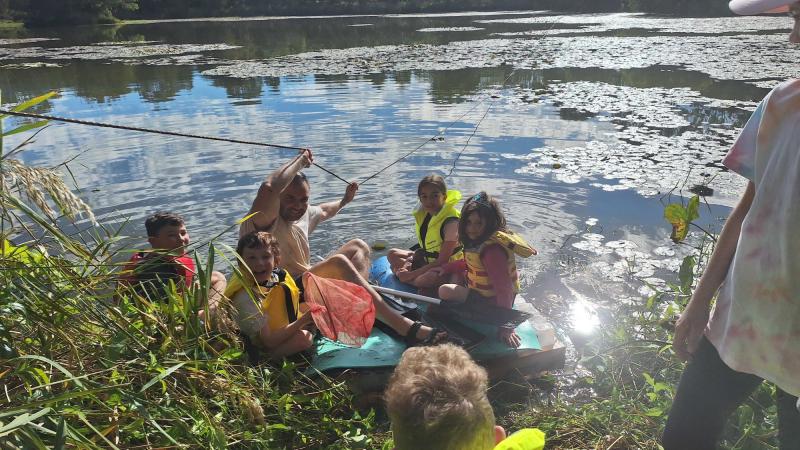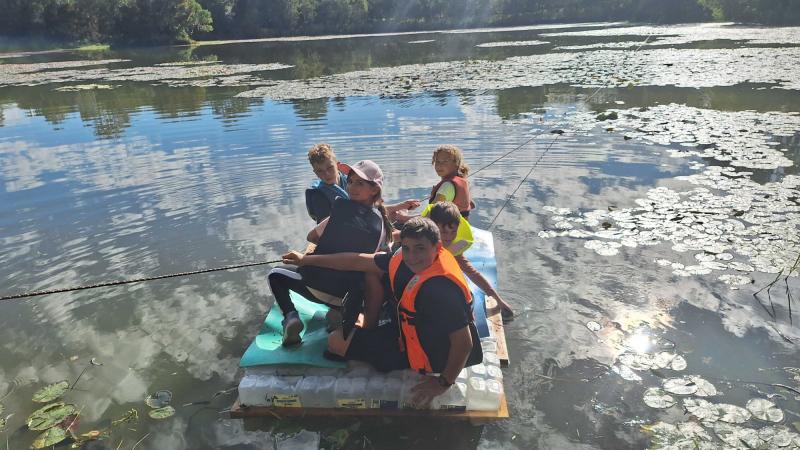 Az ébresztő után közös reggeli tornával indítottuk a napot, majd egy jót reggeliztünk. Választhattunk virsli, szendvics és tejbegríz közül is. Három literes tejes dobozokat összebarkácsolva tutajt készített a csoport egyik fele, a többiekkel pedig fonalból barátság karkötőket fontunk. Ebédre milánói sertésbordát ettünk, majd kipróbáltuk a tutajt a közeli tavon. A gyerekek jó munkát végeztek, mindenki átjutott a túlpartra, ahol játszótér és az uzsonna várt minket. Vacsorára szalonnát sütöttünk és természetesen mályvacukrot is desszertnek. Végül jöhetett a bújócska-fogócska sötétben, elemlámpákkal.