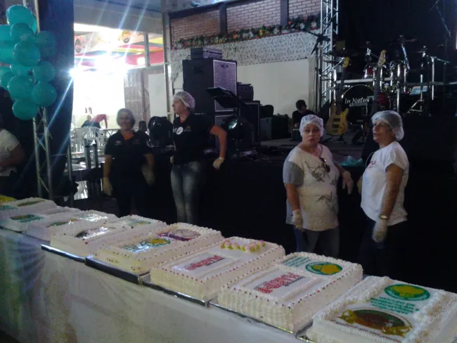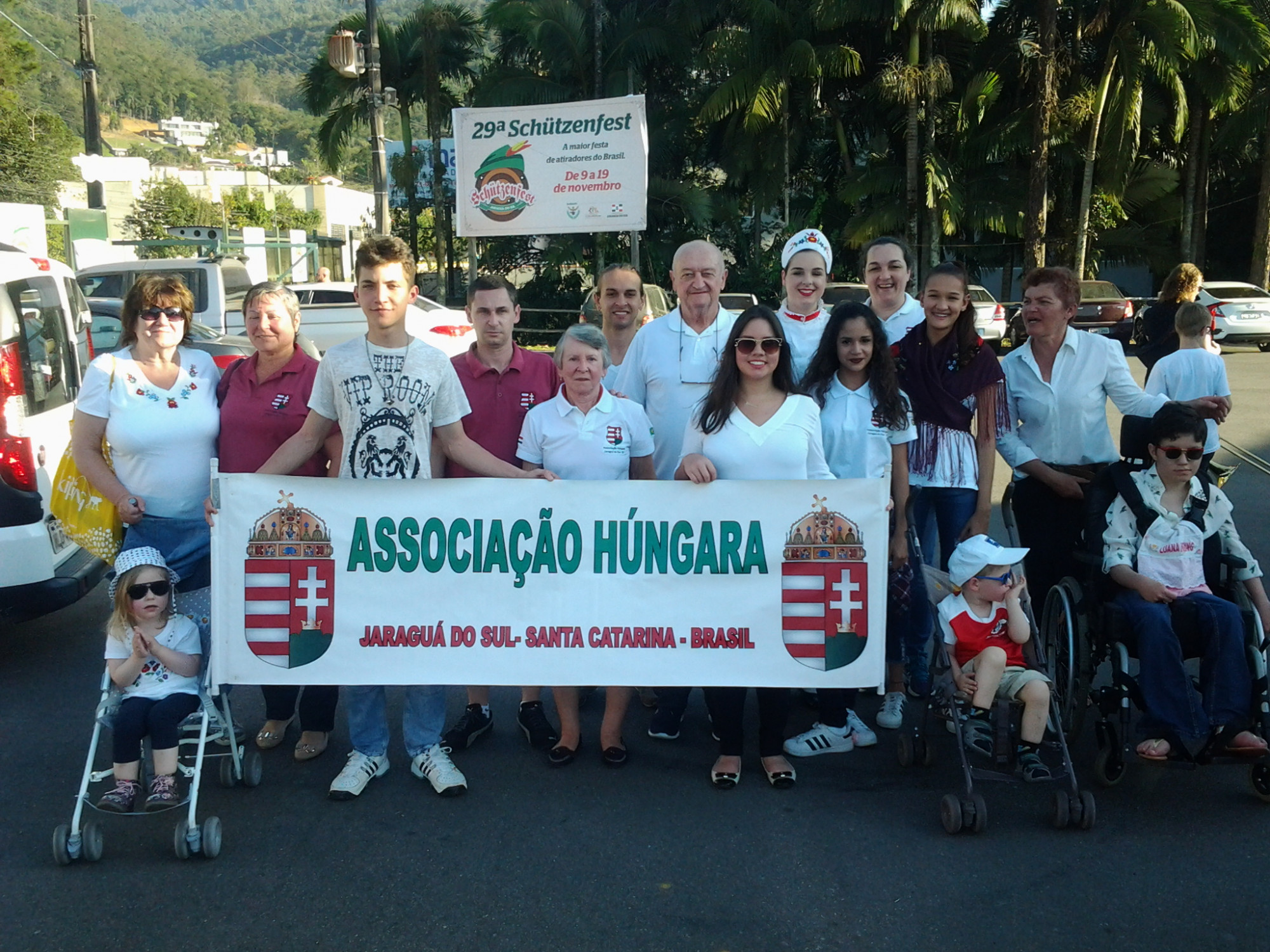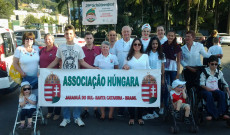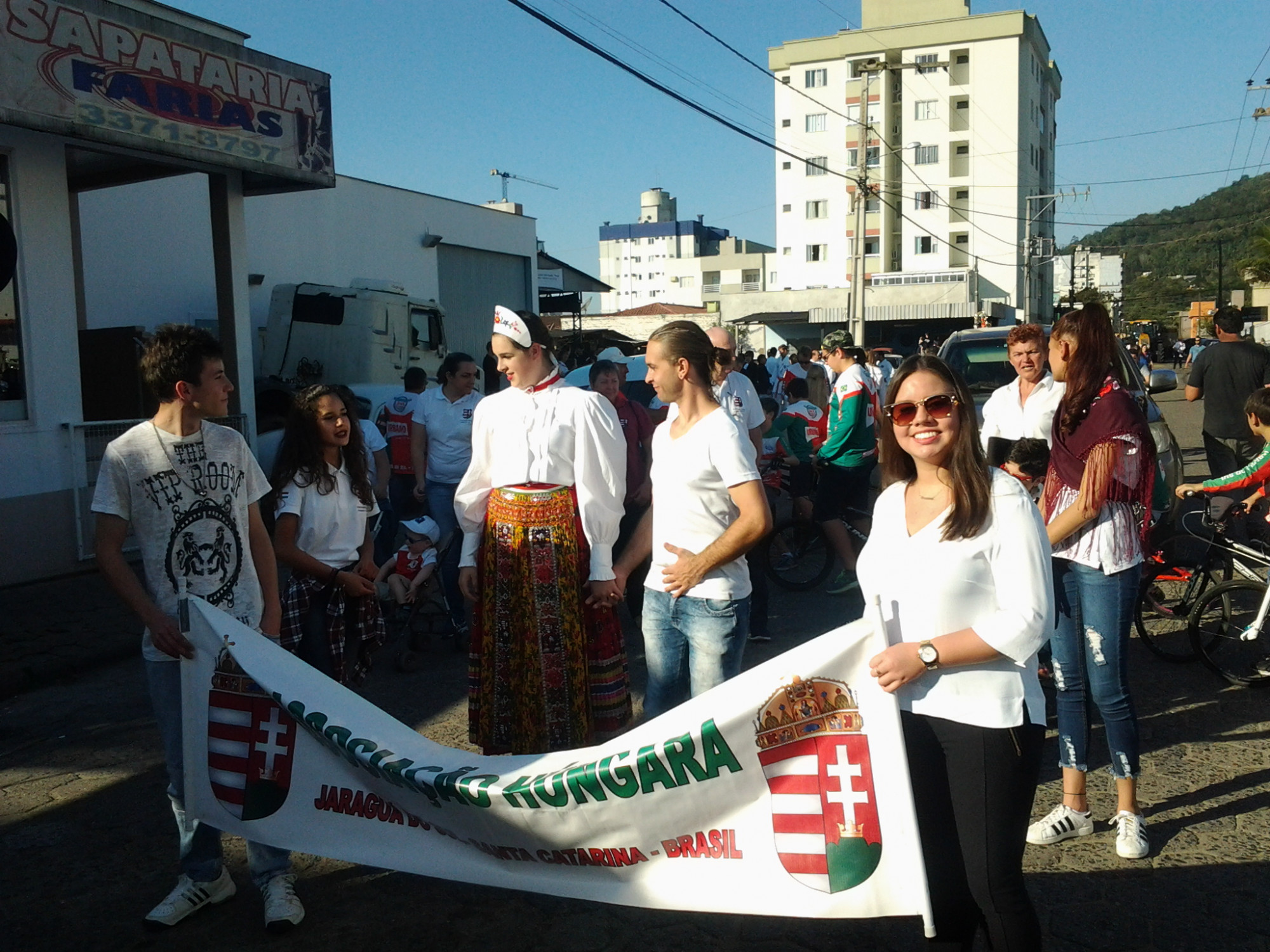 A nagyszabású eseményen különböző nemzetiségű csoportok képviseltették magukat, köztük a német, lengyel, ukrán, olasz, spanyol és nem utolsósorban mi, magyarok. Ez az összefogás szívet melengető érzés volt. A nemzetiségeken kívül helyi szervezetek is részt vettek, úgy mint a Tűzoltók, Cserkészek, Idősek Klubja, Karate Klub, BMX Klub, Városi Fúvószenekar és Motoros Egyesület. Amerre a szem ellátott, népviseletbe és egyenruhába öltözött, zászlókat lengető ünneplő felnőttek és léggömböt tartó gyerekek serege árasztotta el Vila Nova kerület utcáit. A Brazíliai Magyar Segélyegylet csoportja tizennyolcadikként vonulhatott végig a főúton a lelátók és a díszpáholy előtt. Közösségünk élén a 17 éves Gabrielle K. Demarchi haladt, aki az idén ellátogatott Magyarországra és Erdélybe a Rákóczi Program keretén belül. Az út szélén integető, vidám polgárok üdvözölték a felvonulókat. A hőség sem tántorította el őket. A naptár szerint ugyan itt most tél van, de a hőmérő higanyszála e jeles napon meg sem állt a 30 Celsius fokig. Sidnei Marcelo Lopes, a Városháza vezetőségének sokoldalú, lelkes tagja vállalta magára a kommentátori feladatot. Nagy megtiszteltetés volt számomra, hogy engem név szerint említett, mint a magyar közösség jelenlegi KCSP-s ösztöndíjasát és egyben nyelvoktatóját. A felvonulási menet a Schützenfest Parkba tartott, ahol már az asztalokon sorakoztak a szebbnél szebb születésnapi torták. A jaraguai pékek összefogtak és különböző ízesítésű 141 kg finomsággal rukkoltak elő. Ennél édesebb ajándékot a városlakók nem is kaphattak volna. Éljen soká Jaraguá do Sul!
