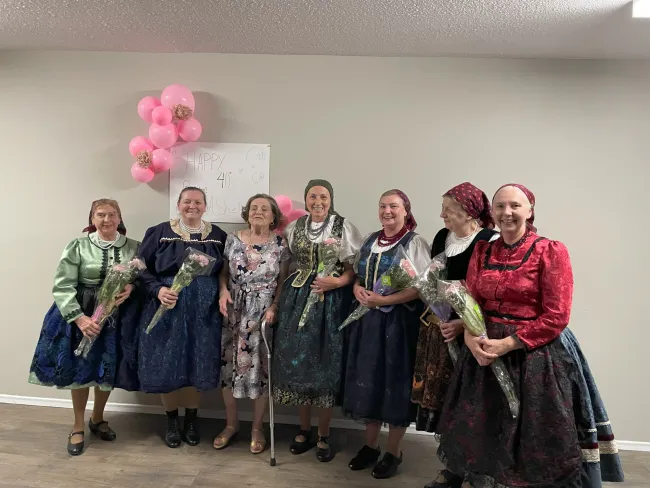 A Kossuth Tánccsoport rangidős csoporttagjai, az Asszonyok, meglepetésként öltötték magukra a népviseletet és táncolták el egyik kedves koreográfiájukat a 90. életévét betöltő Tóth Piroskának.