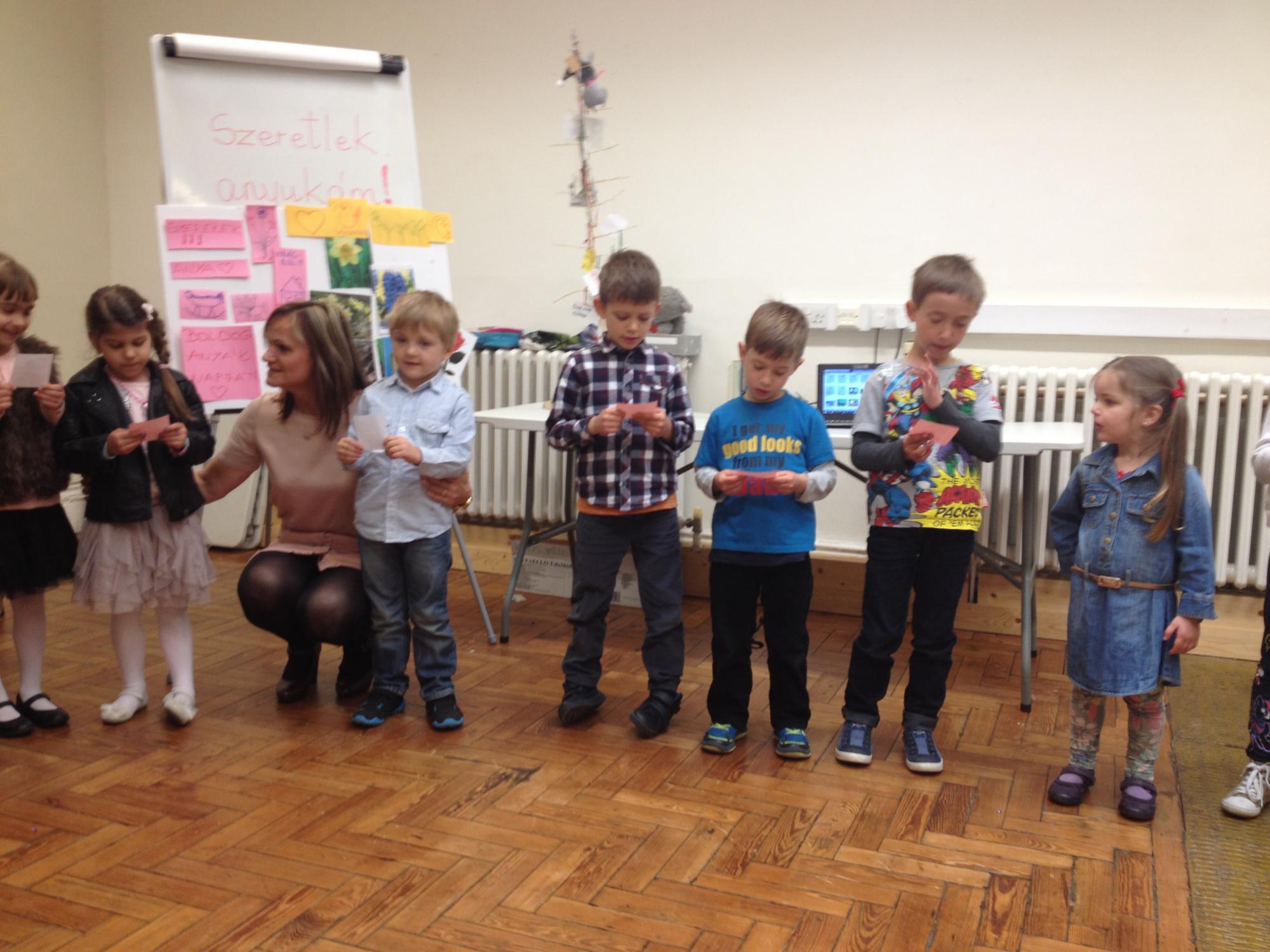 A Tanodanapot most is mesehallgatással és a történet megbeszélésével kezdtük, majd gyakoroltuk az anyák napi verset és éneket. Elkészítettük az ajándékot is saját rajzzal, írással és fotóval, majd a nagyok a báb-előadásukat gyakorolták. Az ebéd után már izgatottan várta mindenki az anyukáját. Szépen berendeztük a termet, majd kezdődhetett a műsor. A vendégek meghatottan hallgattak és néztek bennünket, s a puszik kíséretében átadott tulipán és ajándék igazi meglepetést jelentett a meghatott anyukáknak! A nagyok bábozása pedig mindenkinél hatalmas sikert aratott. A kicsik tátott szájjal hallgatták Boribon színes lufijainak történetét.