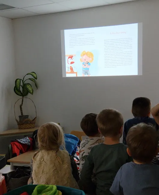 A kreatív ráhangolódást egy igazi kihívás követte: toronyépítő verseny az iskola klubhelyiségének nagyméretű elemeivel. A cél egyszerű volt – minél magasabbra, minél ügyesebben építeni –, de közben a gyerekek észrevétlenül mozogtak, játszottak, együttműködtek. Az építkezést egy rövid uzsonnaszünet szakította meg, majd a falra vetített mesével folytatódott a program: a könyv címadó történetét maga a szerző olvasta fel, így a gyerekek közvetlenül is kapcsolódhattak a történethez.