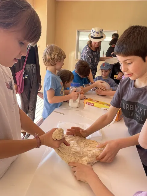 Az ünnepi tanórát közös kenyérsütés tette emlékezetessé. Az egyik kedves szülő már előre elkészítette a tésztát, így a gyerekeknek „csak” a formázás maradt hátra, amelyben természetesen bőven kiélhették a kreativitásukat. Volt, aki hagyományos, kerek cipót készített, mások kígyót vagy játékos formákat álmodtak meg a kenyérből.