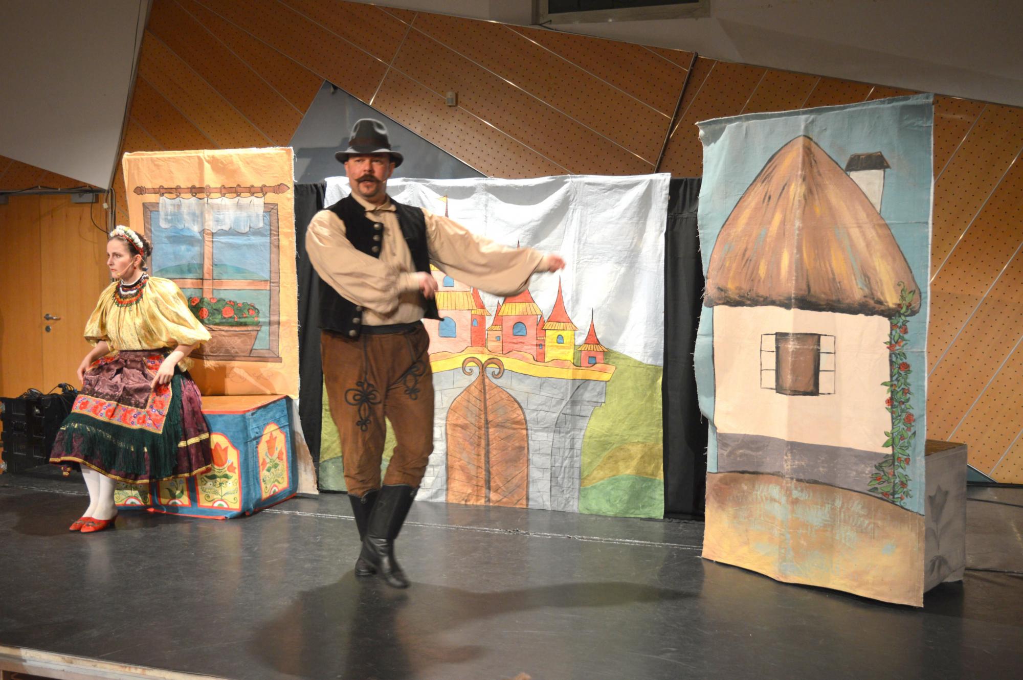 Egy órától a Kuttyomfitty Társulat: Egyszer egy királyfi című remek előadását nézhettük meg, amely méltán aratott zajos sikert a jelenlévők körében. Ez a társulat 2011 óta létezik. Előadásaik, melyekben a táncot néprajzi, zenei és irodalmi elemekkel ötvözik, elsősorban a gyermekeknek szólnak. „Az egyszer egy királyfi című vígballada feldolgozást elsősorban óvodásoknak és kisiskolásoknak ajánljuk. A darabból megtudhatják, hogyan marad hoppon a gőgös, gazdag bíró leánya és hogyan nyeri el a királyfi szeretetét a szegény, kosárkötő lánya. A műsorban sárközi és mezőföldi táncok láthatók. A műsor végén lakodalmi mulatságba visszük a kis nézőket. Szereplők: Dobsa Fodor Mónika (tánc, ének, szöveg), Dobsa Tamás (tánc, ének, szöveg).” (forrás: http://www.kuttyomfitty.sk/egyszer-egy-kiralyfi ).