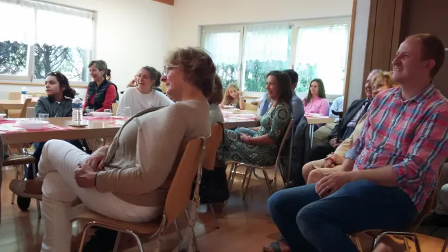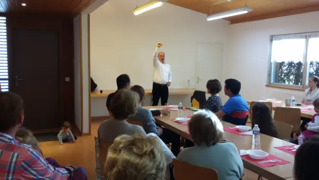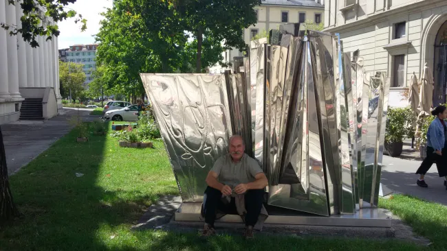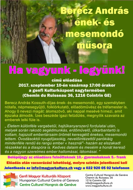 "Ha vagyunk - legyünk!" A Kossuth-díjas ének- és mesemondót Bázel és Zürich után Genfben köszönthettük. Megtisztelő volt, hogy elfogadta a Genfi Magyar Kulturális Központ meghívását. Berecz András a genfi Bartók Béla-szoborral A rendezvényünk plakátja A mese kellős közepén Hahotázik a közönség Címkefelhő Berecz András Genf