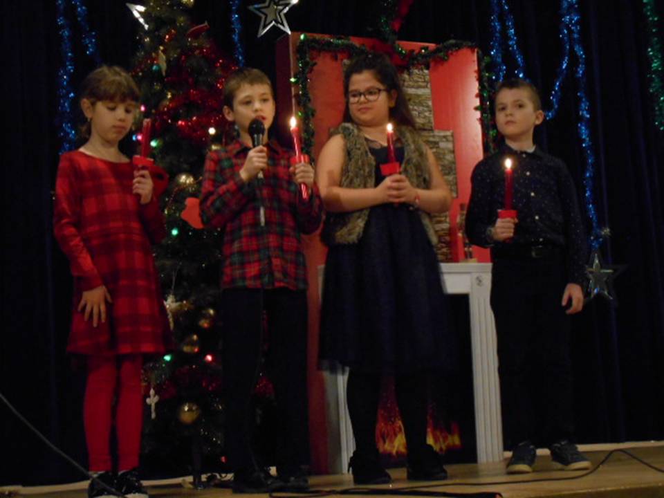 Ezután az iskolások kerültek sorra, akik versekkel és dalokkal teremtettek vidám hangulatot: énekeltek télről, havazásról, karácsonyról és zöld fenyőről, Jézus születéséről, az angyalok és a pásztorok köszöntéséről. Végül előadták a négy gyertya történetét, aminek üzenete, hogy amíg a remény gyertyája ég, addig újra lángra lobbanhat a béke, a hit és szeretet fénye is.