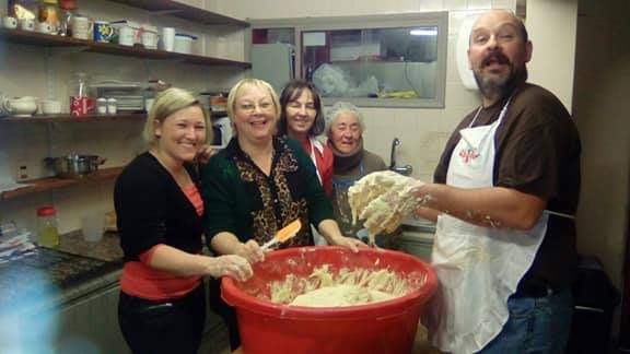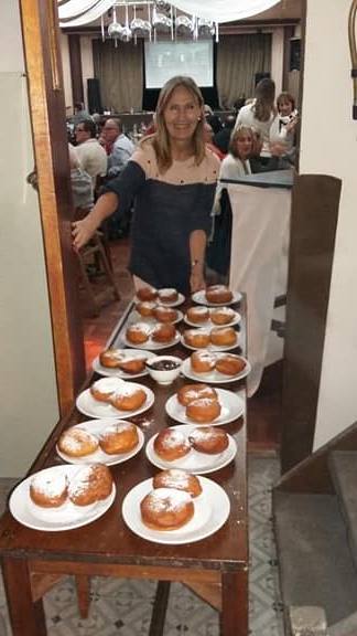 Másnap, vasárnap már kora délelőtt az Otthonban kezdünk és szemtanúja lehettem, hogyan készül 14 kg lisztből 300 db fánk. A közösség női tagjai sürögtek a konyhában, fiatalabbak, idősebbek. Mindenkinek jutott hely, aki segíteni szeretett volna. Amikor a tészta gyúrására került sor, már szükségünk lett férfierőre. Gusztáv volt a megmentőnk, aki mondta, hogy ő a masina, masina helyett.