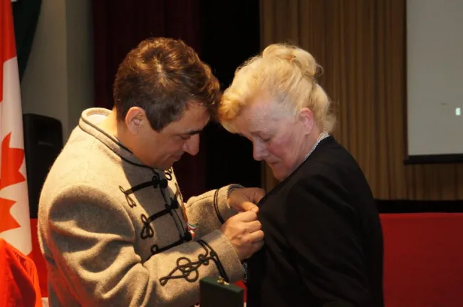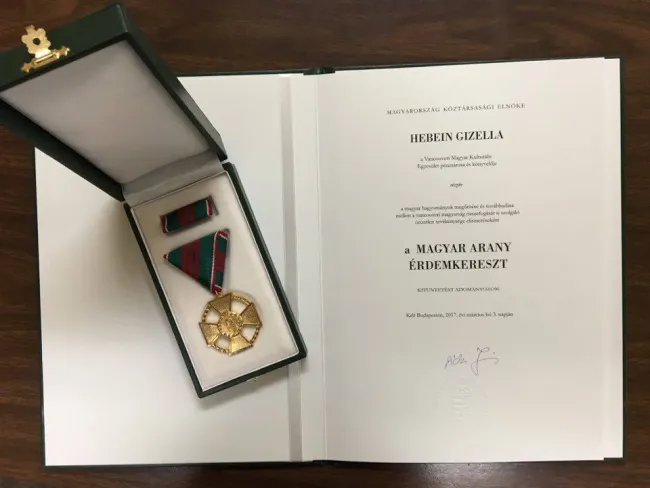 Méltán lehetünk büszkék Hebein Gizellára, hiszen amellett, hogy csodálatos személyiség, egyaránt lelke és mozgatórugója a Vancouveri Magyar Kulturális Egyesületnek, a március 15-ei ünnepségen egy rendkívül megtisztelő elismerést is kapott. A Magyar Ház egykori pénztárosa és könyvelője a Magyar Arany Érdemkereszt kitüntetést vehette át Potápi Árpád János nemzetpolitikáért felelős államtitkártól, melyet dr. Áder János, Magyarország Köztársasági elnöke adományozott a számára.
