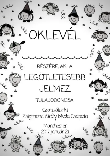 Milyen hangulatban telik egy olyan tanítási nap, amelyre maskarában érkezik mindenki? Bizony, hatványozottan vidáman! Farsangi csoportkép Személyre szabott oklevél -- különféle jelzőkkel Címkefelhő Manchester Zsigmond Király Magyar Iskola farsang Jelmez mulatság