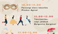 Délelőtt 10 órától Piszker Ágnes, a Szivárvány Gyermek Néptánccsoport vezetője kézműves foglalkozással kezdte meg a farsangi programot, majd 11 órától az én vezetésemmel indult a táncos mulatság. Játszottunk, énekeltünk, és természetesen táncoltunk – gyerekek és szülők egyaránt. A tánc után déltől fánksütés várta az érdeklődőket, ahol megtanulhatták a csörögefánk csínját-bínját.