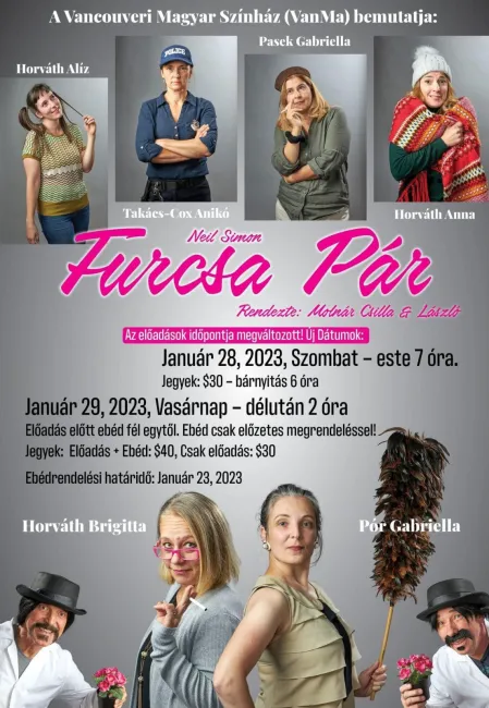 Több hónapos felkészülés és kitartó munka után, január végén mutatta be a Vancouveri Magyar Színház, Neil Simon “A furcsa pár” című darabjának női változatát. Plakát Díszletfestés Társasjáték Odaégett vacsora