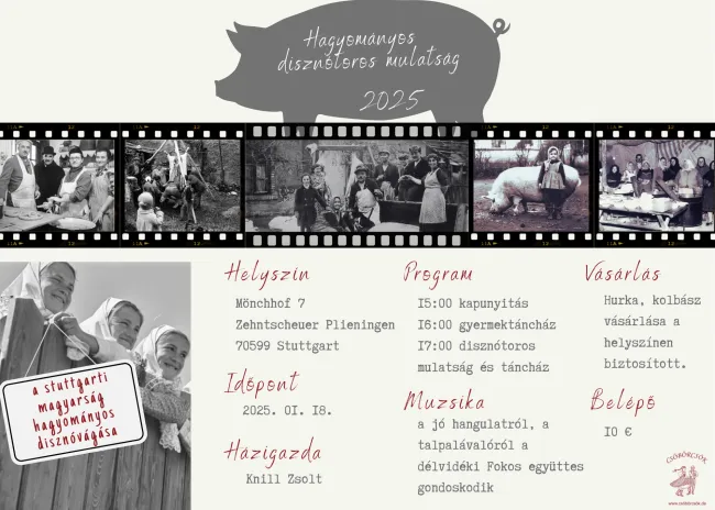 2025. január 18-án Plieningenben gyűltek össze a Stuttgartban élő magyarok hagyományos disznótoros mulatságukra. Az esemény nemcsak a magyar gasztronómia remekeiről szólt, hanem a közösségi élményről, a hagyományok ápolásáról és a jókedvről is. A gyerekeknek délutánra gyermektáncházzal, népi énekekkel készültek a szervezők, az est folyamán felléptek a Csöbörcsök Néptáncegyüttes táncosai.