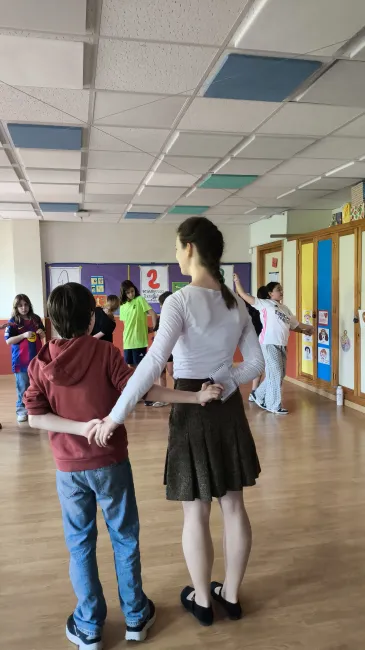 A foglalkozás végén a hangulatot tovább fokozta a tánc. A páros tánc különösen nagy élmény volt, ugyanakkor kihívást is jelentett számukra. A gyerekek – főleg a fiúk – nincsenek hozzászokva ahhoz, hogy ebben az életkorban párban táncoljanak, így hamar feladták inkább, de végig nagyon jó hangulat uralkodott. Én személy szerint sokat nevettem, mert nekem is új volt a tánc, és bizony belegabalyodtam.