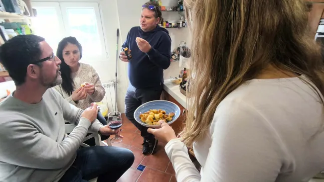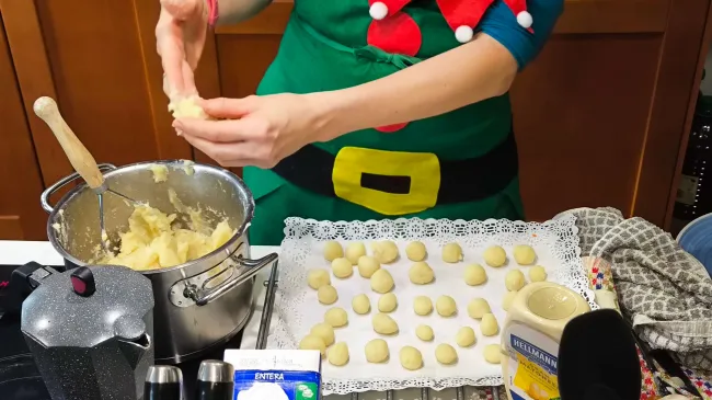 Az étel nagyon egyszerű: krumpli és liszt kell hozzá. A spanyol és kolumbiai családtagok érdeklődve figyelték az elkészítését, és amikor elmondtam, hogy az eredeti recept szerint sertészsírban sült hagymába kellene forgatni a krumplidarabkákat, teljesen hátrahőköltek. Aztán megnyugodtak, amikor meglátták az asztalon az olívaolajat. Nagyot nevettem, és mondtam nekik: