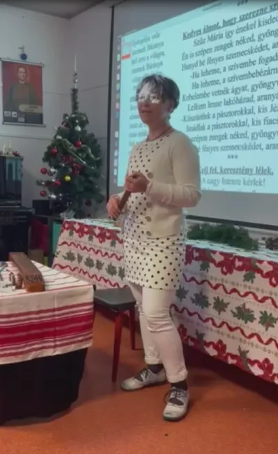 Néhány egyesületi tag önzetlen segítsége nélkül természetesen ma sem szervezhetnének ilyen pompás rendezvényeket, mint ez a karácsonyi: megterítettek, tálaltak, mosogattak, takarítottak. S amíg zajlott a rendezgetés, Anikó még egy kis magyar matekórát is beékelt a tennivalók közé.