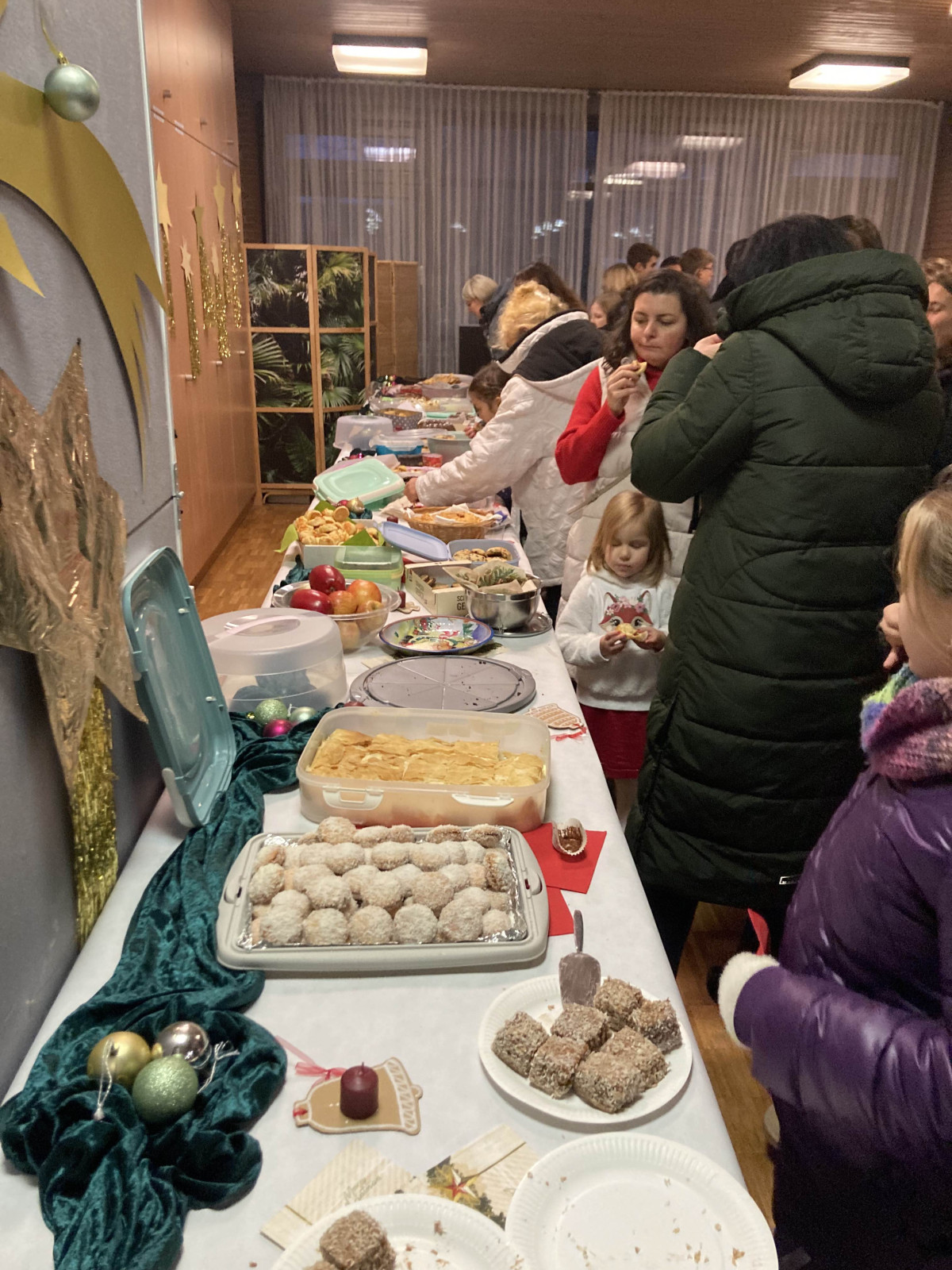 A karácsonyváró ünnepség igazi közösségi eseménynek bizonyult, hiszen az azt megelőző napon főpróbát tartottunk, mely alatt a szülők nagy része szorgosan díszítette a termet. Zöld girlandokkal, csillagokkal és gyertyákkal borították be a helyiséget, miközben a gyerekek éneke a szülők jó hangulatú beszélgetéseivel keveredett. A dióval, sógyurmából készült mézeskalács formájú díszekkel, tobozokkal, angyalokkal díszített karácsonyfának méltó helye lett a színpadon.