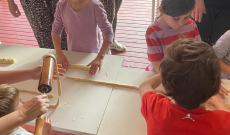 Az igazi mulatság azonban csak ezután kezdődött. A szülők már előre bedagasztották otthon a kürtőskalács tésztáját, így a helyszínen már „csak” a formázás és a sütés maradt hátra – persze ez sem kevés! A kürtőskalácssütőt a nemrég megrendezett lengyel–magyar fesztiválról kölcsönöztük, és kiválóan tette a dolgát.