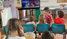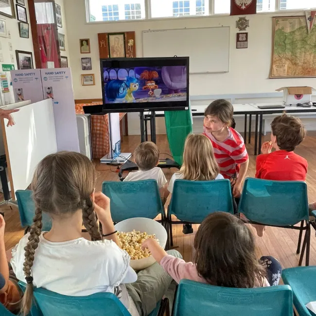 Miközben a sütés folyamatosan zajlott, a gyerekek számára többféle elfoglaltságot is biztosítottunk. Egy közösen kiválasztott magyar nyelvű filmet vetítettünk, amelyet a gyerekek (és néhány felnőtt) örömmel és figyelemmel néztek végig. Számunkra az iskolában ez különösen fontos visszajelzés, hiszen ez is mutatja, mennyit fejlődtek a gyerekek a nyelvi megértésben. A film mellé természetesen popcorn is járt, hogy teljes legyen a moziélmény.