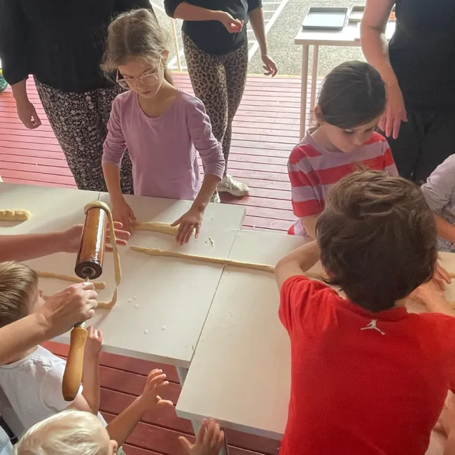 Az asztalok köré gyűlt gyerekek és felnőttek együtt dolgoztak: sodorták, formázták, feltekerték a tésztát a sütőfára, majd izgatottan várták az ízletes végeredményt. Az egyik szülőpár saját titkos receptje alapján készült minden kürtőskalács és a végeredmény magáért beszélt!