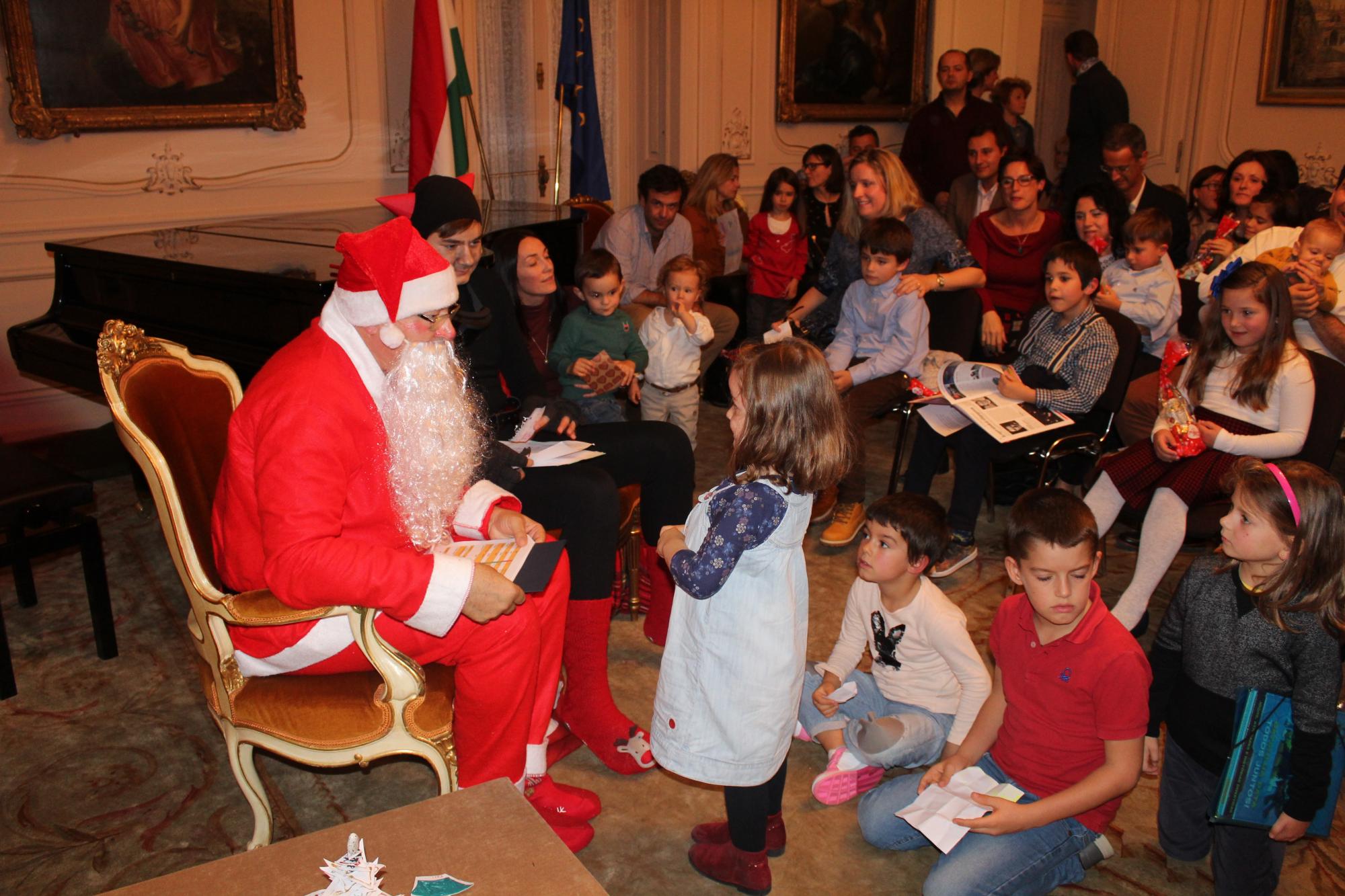 A közel negyven gyereket a Mikulás egyenként szólította, és az ajándékcsomagért cserébe a gyerekek átadták rajzaikat, de volt aki hegedült, furulyázott, mások pedig verset adtak elő. Miután mindenki megkapta az ajándékát, a nagykövet asszony átadta az Ágymester Manufaktúra által, a portugáliai magyar közösségnek felajánlott vándorbölcsőt az első tulajdonos leendő édesapjának. A gyerekek is megnézték közelről a bölcsőt és egyikük ki is próbálta. Remélhetőleg sok családnak okoz még örömöt és nyugodt álmokat a szép bölcső a jövőben.