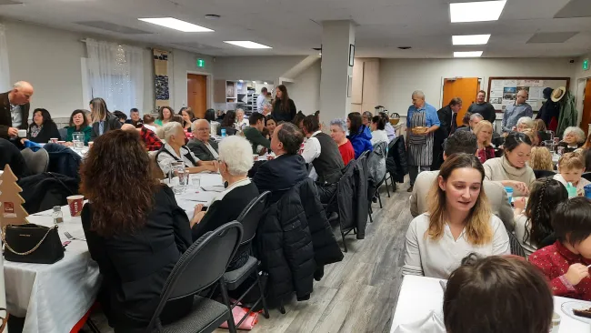Az istentisztelet végére, már csak az utolsó simítások hiányoztak. Az előadás szépen összeállt és az ünnepi ebéd is elkészült. A templom alatt található közösségi terem kisvártatva teljesen megtelt. Akkora érdeklődés övezte a karácsonyi műsort, hogy egy talpalatnyi szabad hely sem maradt pótasztalok és további székek felállítására. Így jó páran állva nézték végig a műsort. Ez összességében azt jelenti, hogy száznál is többen látogattak el a rendezvényre.