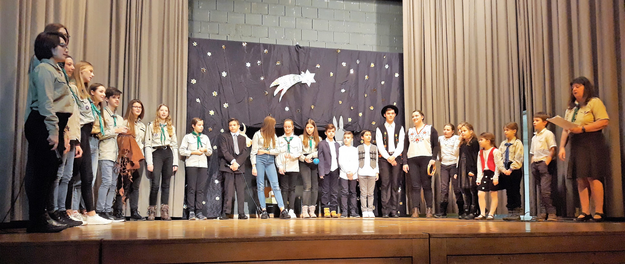 A felső tagozatosok műsorán megmutatkozott, hogy rutinos előadókkal van dolgunk, ami nem véletlen, hiszen ők már óvodás koruk óta szerepelnek nagy közönség előtt a magyar rendezvényeken. Minden bizonnyal életük során később is nagy hasznukra válik majd, hogy bátran ki mernek állni emberek elé beszélni és szerepelni. A karácsonyi műsor a cserkészek előadásával folytatódott. Pilinszky Katalin vezetésével a regölés évezredes hagyományát elevenítették fel a liliom jelvényesek, természetesen aktualizált változatban, modern korunknak megfelelő, olykor tréfás jókívánságokkal az új esztendőre.