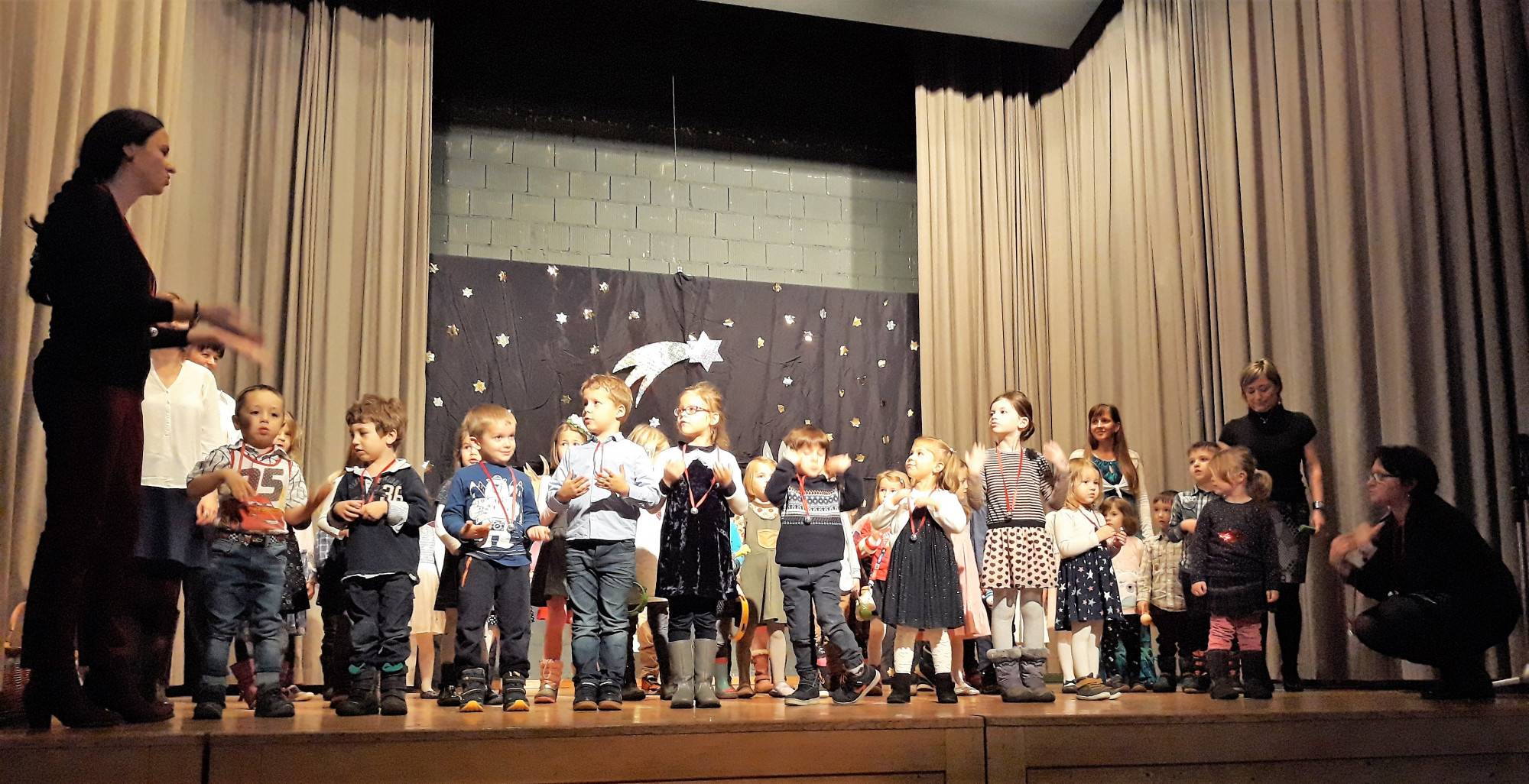 Ezt követően az óvodások szereplésével elkezdődött a kétszer fél órás műsor. Láthatóan sokat készültek a kicsik nevelőikkel a programra, énekes-táncos játékuk minden mozdulatán érződött a rengeteg gyakorlás. A legkisebbek után az alsó tagozatos iskolások következtek, akiket szeretett tanárnőjük, Demeter Andrea vezetett a színpadra. A bámulatos koreográfiával megalkotott produkciót a bátrabb alsósok önálló szavalatai tarkították a hálás közönség legnagyobb elismerésére.
