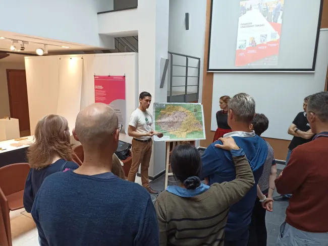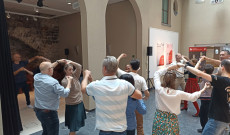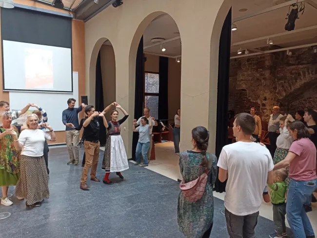 A Liszt Intézet munkatársai ügyesen éltek ezzel a lehetőséggel, és a Heritage Dayst felhasználták arra, bemutassák a magyar kultúrát az épületbe betérő látogatók számára. Ennek részeként Monzolai Flóra és Csendes Gergely, a Viola Dance Ensemble két tagja, különleges magyar néptánc oktatást tartottak az érdeklődők számára. A program négy órán keresztül zajlott, és nagyon jó hangulatban telt, a résztvevők lelkesedésének és a táncosok tapasztaltságának köszönhetően. Minden egyes órában egy rövid, ám lényegre törő ismertetőt tartottak a magyar néptáncról, a népzenéről, és arról, hogyan működnek a táncházak. Egy térkép segítségével vizuálisan is bemutatták a Kárpát-medence különböző tájegységeit, és elhangzottak a legfontosabb információk mindegyik tájegységről, így a látogatók átfogó képet kaptak a magyar néptánc gazdag hagyományairól.