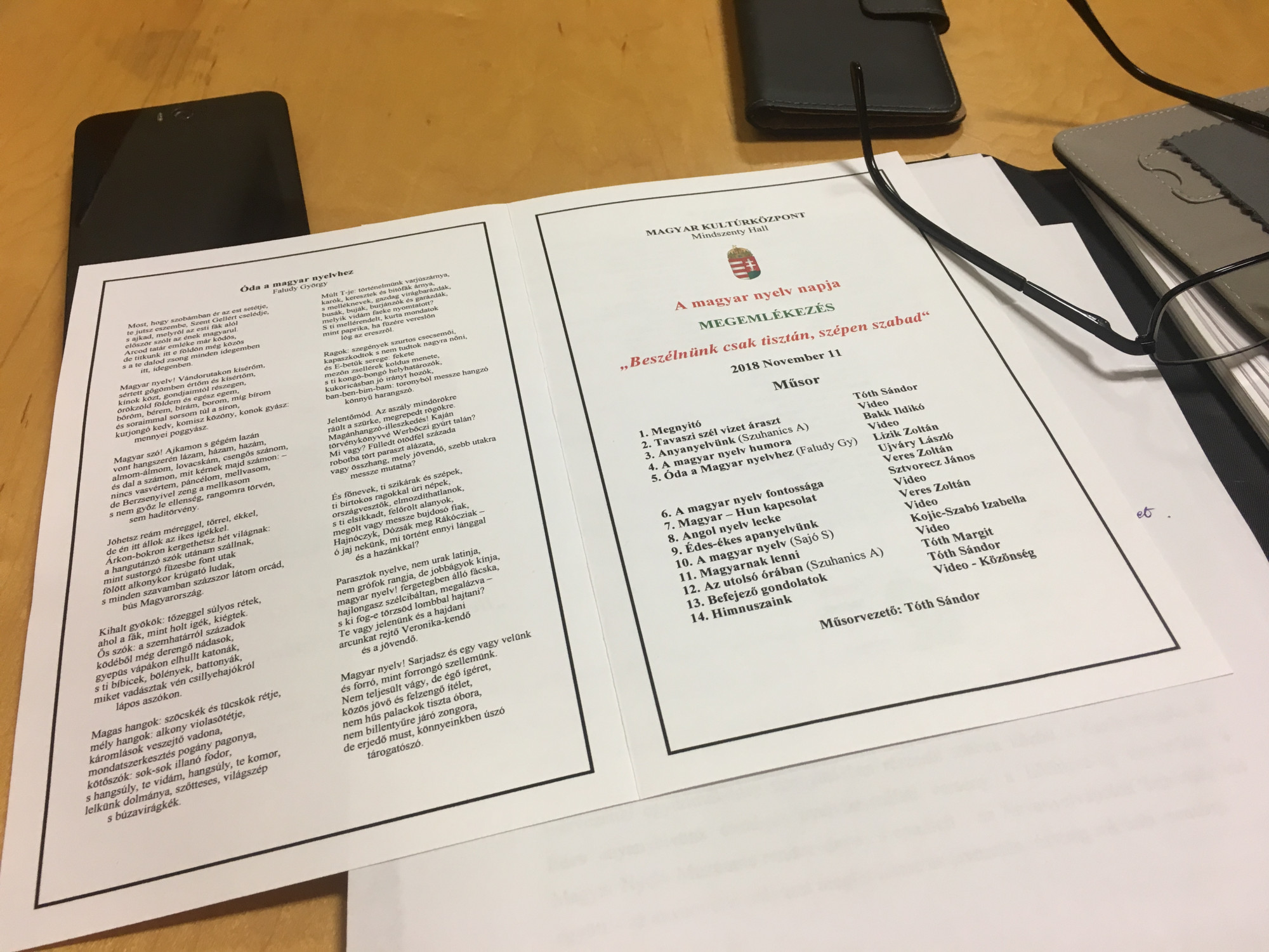 A műsor során rövid áttekintést kaptunk a magyar nyelv történetéről és arról, hogy mit jelent a magyar nyelv a külföldön élő magyarok számára. A zenés betétekkel tarkított összeállításban több csodás szavalatot hallgathattunk meg a közösség tagjaitól. Elhangzott többek között Szuhanics Albert: Anyanyelvünk; Faludy György: Óda a magyar nyelvhez és Sajó Sándor: A magyar nyelv című költeménye. A humor is helyett kapott a programban, hiszen kétértelműségekben és nyelvi játékokban bővelkedik az anyanyelvünk.
