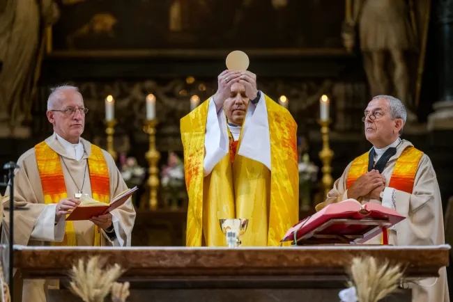 A szentmise főcelebránsa Mohos Gábor, az Esztergom-Budapesti Főegyházmegye segédpüspöke, a külföldi magyarok pasztorációjáért felelős püspök volt. Az osztrák és a magyar papság közösen mutatta be az Áldozatot. Köztük Franz Scharl, a Bécsi Főegyházmegye segédpüspöke, Dariusz Schutzki püspöki helynök, valamint az Ausztriában szolgáló magyar atyák – Szabó Ernő főlelkész – és Varga János, a Collegium Pazmanianum rektora, a szentmise egyik házigazdája és kiemelt közreműködője. Jelen volt továbbá Pál László atya, a Kismartoni Egyházmegye magyarokért felelős helynöke, Galgóczy Rudolf atya, Lég plébánosa, Keresztes Andor atya, Máriagyüd plébánosa és Kiss G. Barnabás OFM Detroitból.