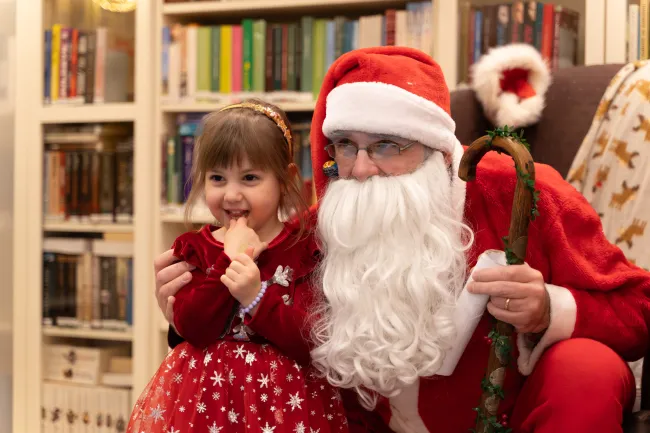 Ezt követően a Mikulást közös énekszóval vártuk, aki nem sokkal később meg is érkezett a segédjével. A listája igen hosszúra sikeredett, hiszen a manói egész évben füleltek, gyűjtötték az információkat a gyermekekről. Ráadásul a Mikulás külön csomaggal készült a 0-2 éves, valamint a 3-10 éves korosztály számára, figyelembe véve a különböző érzékenységeket is. A gyermekeket egyesével, név szerint szólította, átadta nekik az ajándékokat, miközben mindenkit megdicsért az alapján, hogy miben jeleskedett az elmúlt egy évben. Egyes lurkók igen csak meglepődtek a Mikulás tájékozottságán!