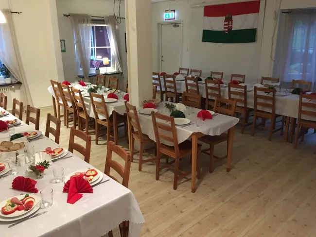 Svédország magyar egyesületeinek vezetői találkoztak Hälleberga Tábortanyáján. Teríték Tangóharmonika Dobos torta Címkefelhő közgyűlés SMOSZ Hälleberga