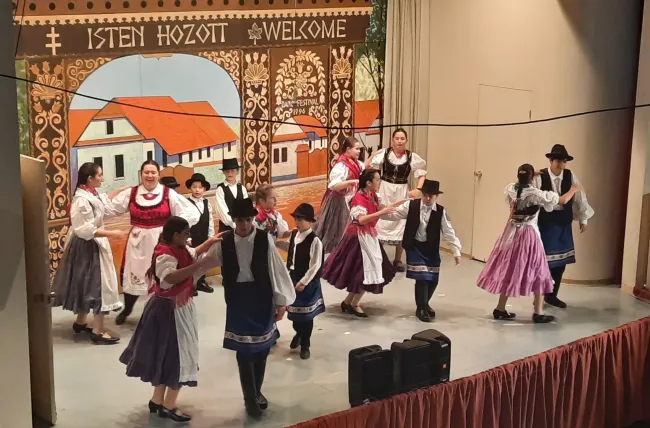 A szentmise után bőséges és ízletes ebéd, valamint a vancouveri magyar néptánccsoportok műsora várta a vendégeket. Elsőre is látszódott, hogy milyen sokan voltak jelen az ünnepségen, hiszen a nagyterem teljesen megtelt és a konyhában több mint 180 adag étel készült. Az ebédet a Csárdás Gyermek Néptánc Együttes fellépése követte. A gyerekek szilágysági táncot mutattak be. Utánuk a Forrás Felnőtt Néptánc Együttes táncosai léptek a színpadra. A felnőttek bemutatója erdélyi, egészen pontosan, nyárádmenti tánc volt. Mindkét produkciót hatalmas taps fogadta.