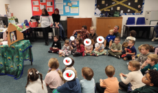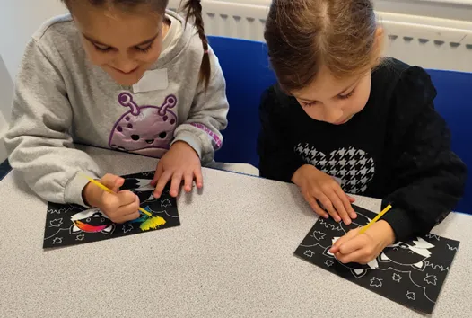 Rövid szünetet követően kezdetét vette a kézműves foglalkozás, ahol a gyerekek karcolásos technikával hangolódtak az őszre: színes állatok és tájak kerültek elő a fekete lapok alól. Ezután közös énektanulás következett – a „Pál, Kata, Péter jó reggelt!” című dalt zenés kísérettel tanulták meg a gyerekek.